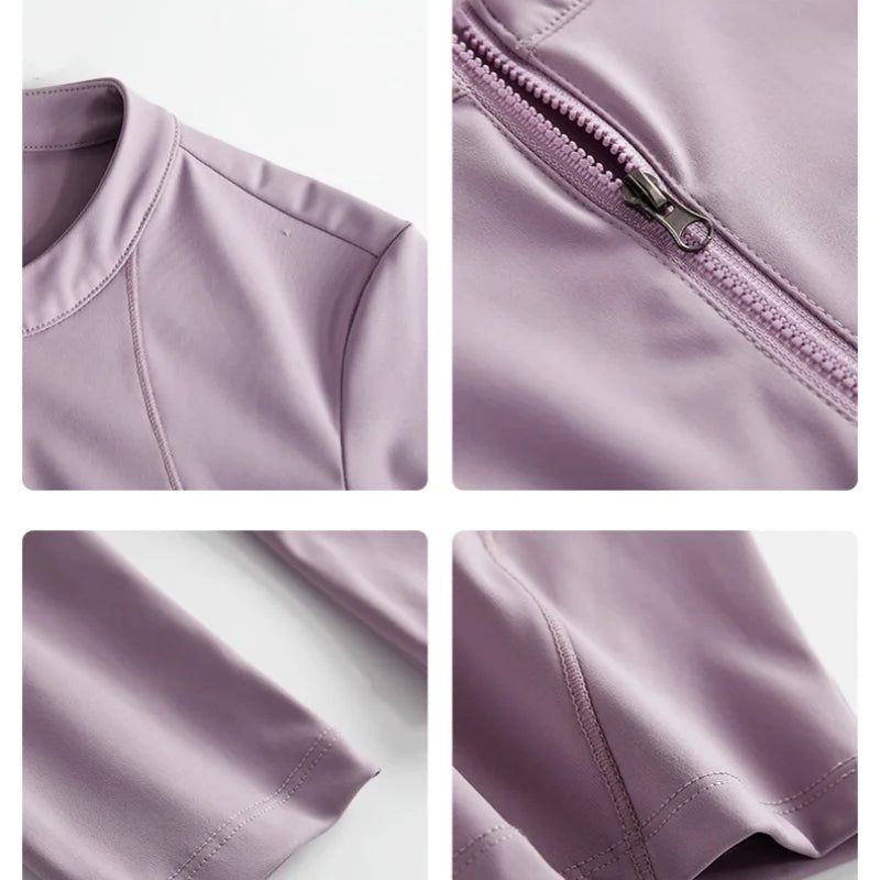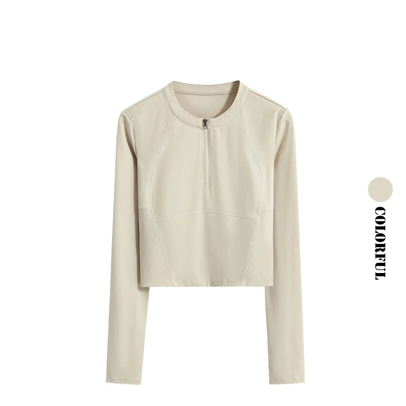 - Long-sleeve crop top with a practical front zipper for easy on/off and adjustable coverage during any workout.